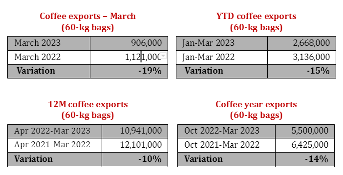 In March, exports fell 19% to 906,000 60-kg bags of green coffee from over 1.1 million bags sold abroad in the same month of 2022.