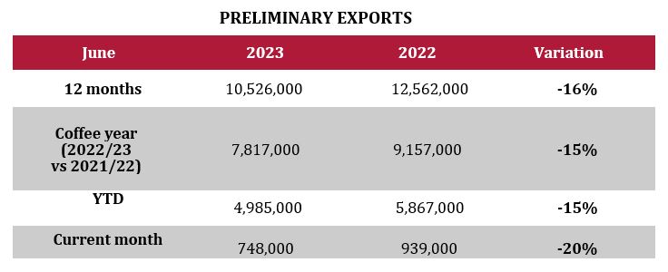 From July 2022 to June 2023, coffee exports reached 10.5 million bags, down 16% from the volume seen a year earlier.