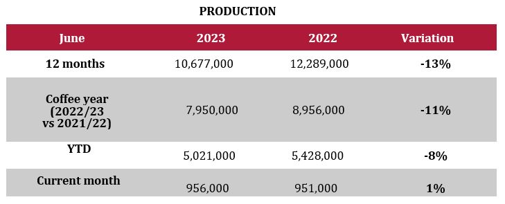 Registered coffee production in Colombia, the world’s largest producer of mild washed Arabica, rose 1% in June from 951,000 60-kg bags in 2022 to 956,000 bags in the same month of 2023.
